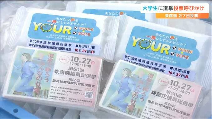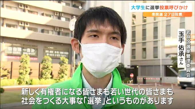 10月27日投票の衆議院議員選挙に向けて仙台市の大学キャンパス前で若林区の職員らが若い人たちに投票にいくよう呼びかけました。