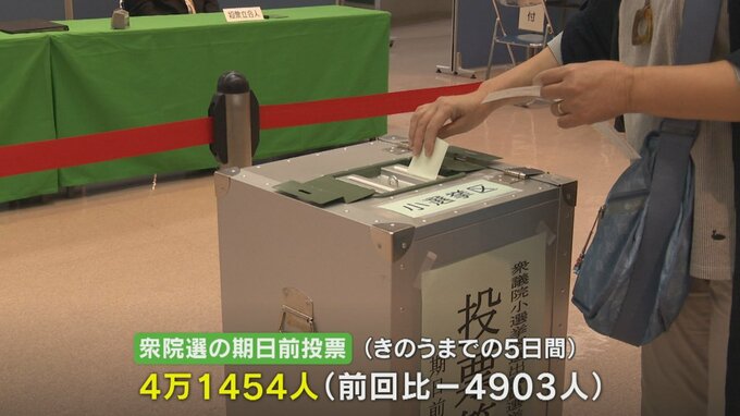 山梨県の選挙管理委員会によりますと、20日までの5日間で期日前投票を済ませた人は4万1454人で、前回3年前の衆院選の時に比べて4903人減っています。