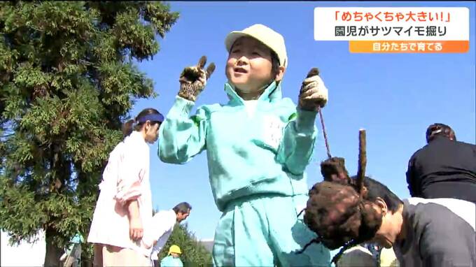 21日、仙台市内の幼稚園児が自分たちで育てたサツマイモの収穫作業に挑戦しました。大きなサツマイモを掘り起こしみんな笑顔で収穫を楽しんでいました。