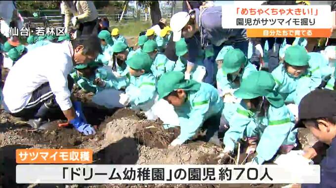 サツマイモ掘りに挑戦したのは、仙台市若林区のドリーム幼稚園の園児およそ70人です。園児たちは、今年5月に苗を植え、水やりや草取りなどをして大切に育ててきたサツマイモおよそ150株を次々と掘り起こしていきました。中には、自分の顔ほどの大きなサツマイモを掘り起こした園児もいました。