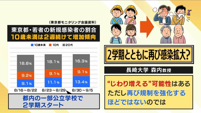 「東京都のデータですけど、あれは百分率で示していますが、絶対数として見ればどの年代層でも減ってはきています。ですので、学校が始まったから一気に増えるということではないと思います。今のオミクロン株の潜伏期とか、発症する前からウイルスを出していることを考えると、だいたい2~3日周期でどんどん増えるなら増えていくはずですので、学校が始まった影響というのがもしかなり大きいものであれば、今頃はもっともっと爆発的に増えているだろうと思います。多少増えるとしても、規制を強化するほどのレベルに達することは、私はかなり低いのではないのかなと思っています」