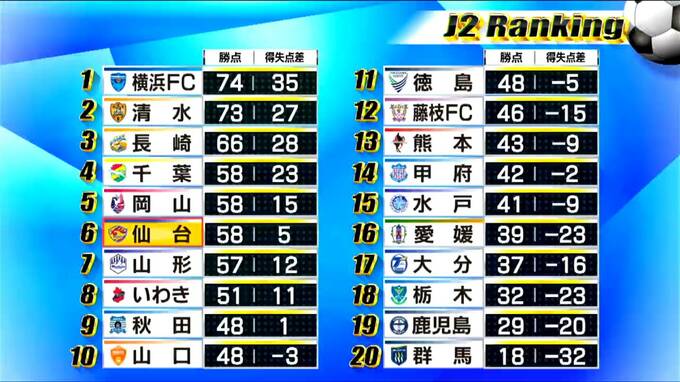 サッカーJ2・ベガルタ仙台は19日、ホームで首位・横浜FCに3得点の快勝。プレーオフ進出へ大きな勝利となりました。