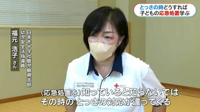 (日本赤十字社鹿児島県支部・幼児安全法指導員 福元浩子さん)「(応急処置を)知っていると知らないでは、その時のとっさの対応が違ってくる。(子どもは)好奇心の塊。成長がそれぞれ違うので、それにあわせた処置が必要になる。それが大事」