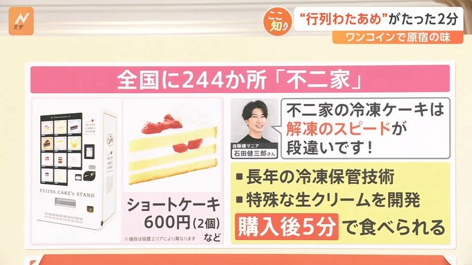 自販機マニアの石田さんは「不二家の冷凍ケーキは、解凍のスピードが段違いです」としていて、▼長年の冷凍保管技術、▼特殊な生クリームを開発していて、▼購入後5分で食べられます。