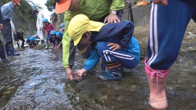 21日、山梨県市川三郷町で地元の保育園児によるアマゴの稚魚の放流体験が行われました。