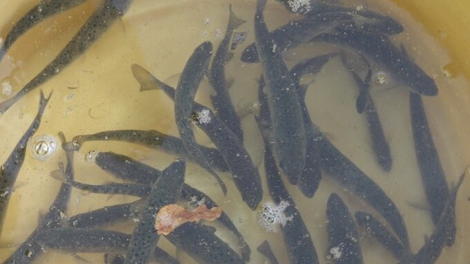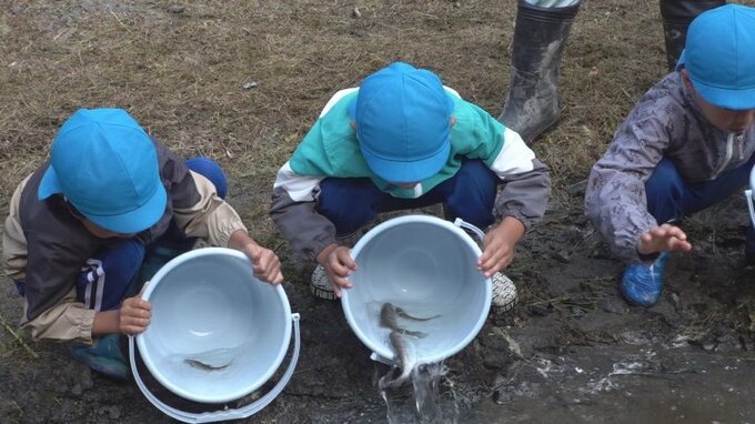 園児たちは、およそ15㎝のアマゴの稚魚が入ったバケツを受け取ると、川岸に一列に並んでおよそ400匹を放流し、泳いでいる稚魚の様子をじっと見守っていました。