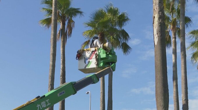 10月21日、電線の管理など高い所で仕事をする工事関係者が、作業車を使ってパーム椰子の剪定作業を行いました。これは毎年、10月15日から25日までの11日間を「さわやかコミュニティ旬間(じゅんかん)」として九電…