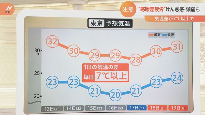 秋になると朝晩の寒暖差が大きくなり、その差が7度以上になると寒暖差疲労を感じやすくなると言われます。その時期に近づいているのか。13日からの東京の予想気温を見ていきましょう。最高気温の予想は30度前後という日が続き、最低気温の予想は20度を少し超えた日が多くなります。13日から1週間は1日の気温の差が毎日7度以上あり、寒暖差疲労を感じやすい時期に入ってきたと言えるのではないかと思います。一時期よりも最低気温が下がってきましたね。
