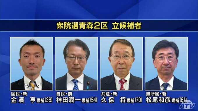 衆院選青森2区には、国民民主党の新人・金濱亨氏(36)、自民党の前職・神田潤一氏(54)、共産党の新人・久保将氏(70)、無所属の新人・松尾和彦氏(61)の4人が立候補しています。