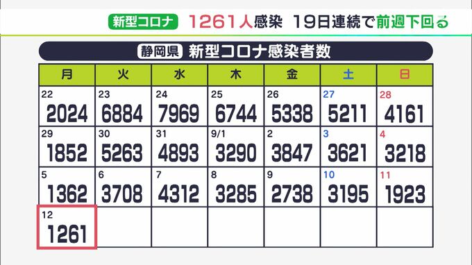 静岡県内では9月12日、新たに1261人が新型コロナウイルスに感染したことがわかりました。19日連続で前の週の同じ曜日を下回っています。感染者を自治体別にみますと、浜松市で237人、静岡市で142人、富士市で110人…