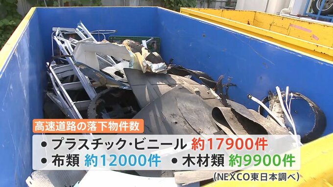 NEXCO東日本によると去年一年間で一番多く処理した落下物はプラスチック・ビニール(約17900件)。次いで布類(約12000件)、木材(約9900件)などです。実はこれら重量が軽いものこそ、特に危険で注意が必要だといいます。