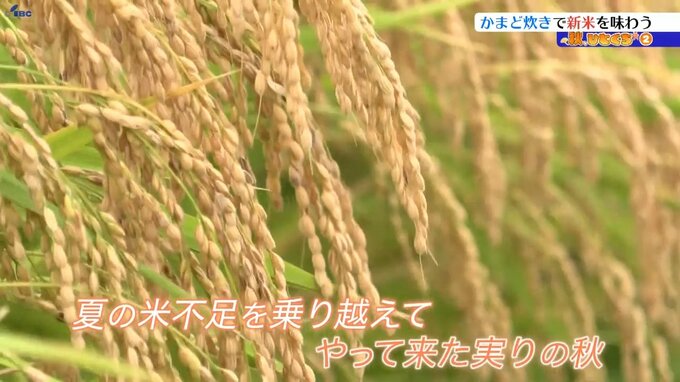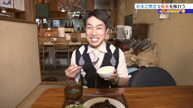 「かま炊きの新米です。いい香りが食欲をそそります。そしてつやつやしていてきれいですね。秋ひとくち頂きます。お米の甘みとうまみ。適度にもちっとした粘り気があって。おいしいですね」
