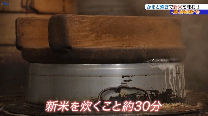 釜のふちから、吹き出す蒸気。火加減を調整しながら新米を炊くことおよそ30分。最後に10分ほど蒸らしてふたを開けると…。ピカピカに光り輝くご飯が炊き上がりました。