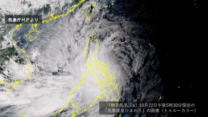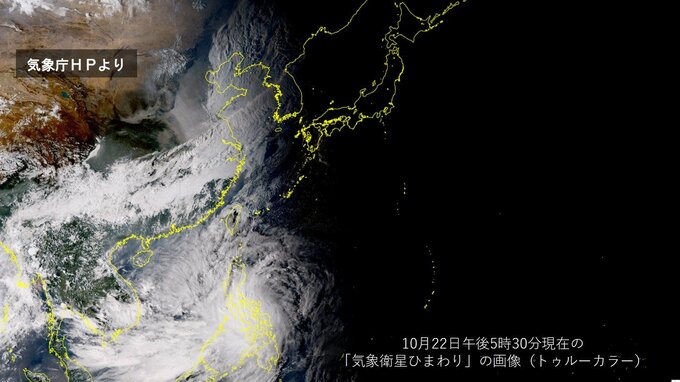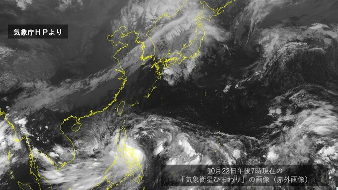 大型の台風20号(チャーミー)は、22日午後9時現在、日本の南側で「フィリピンの東」の位置で、時速15kmの速さで西北西へ進んでいます。
