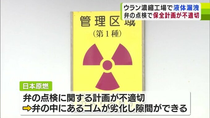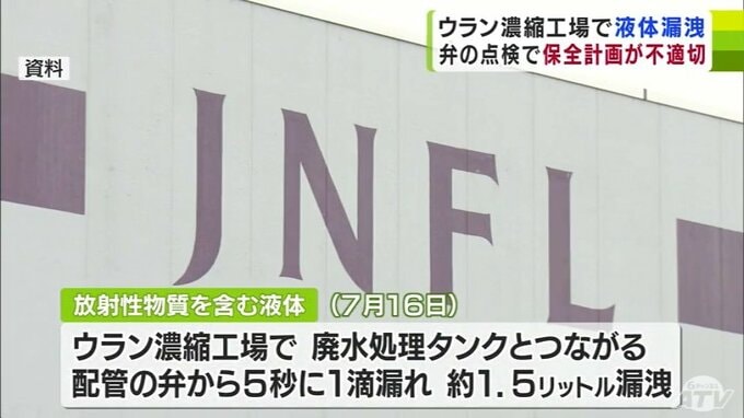 日本原燃は2024年7月に、ウラン濃縮工場で放射性物質を含む液体約1.5リットルが漏れたことについて、原因は配管の弁の点検に関する計画が適切ではなかったためと発表しました。