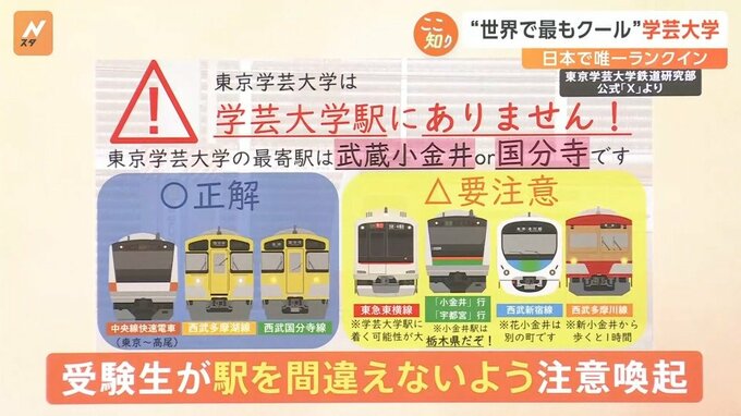 東京学芸大学の鉄道研究部は、受験生が駅を間違えないよう「東京学芸大学は学芸大学駅にありません!東京学芸大学の最寄駅は武蔵小金井or国分寺です」と注意喚起しているといいます。