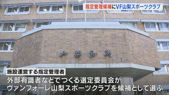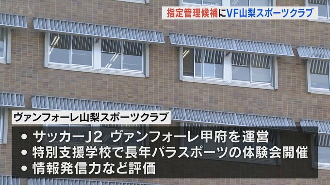 この施設を運営する指定管理者を募集していましたが応募のあった2つの団体から外部の有識者などでつくる選定委員会がヴァンフォーレ山梨スポーツクラブを候補として選びました。