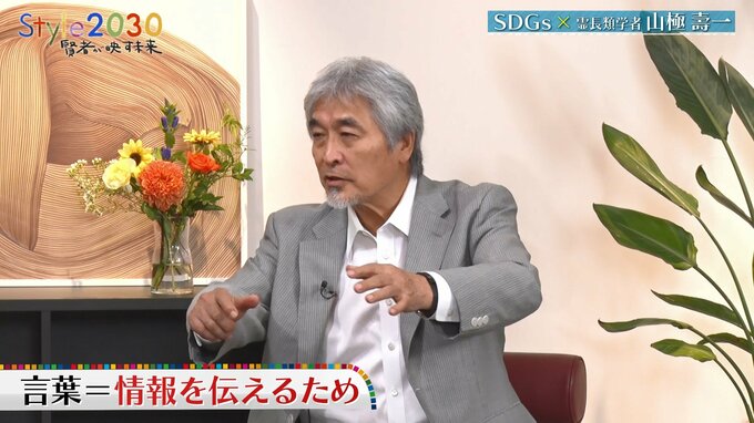 言葉って情報なんだよ。情報を伝えるために現れた。ゴリラってずっと一日中みんなまとまって顔を合わせて動いているから、情報を伝え合う必要がないわけ。