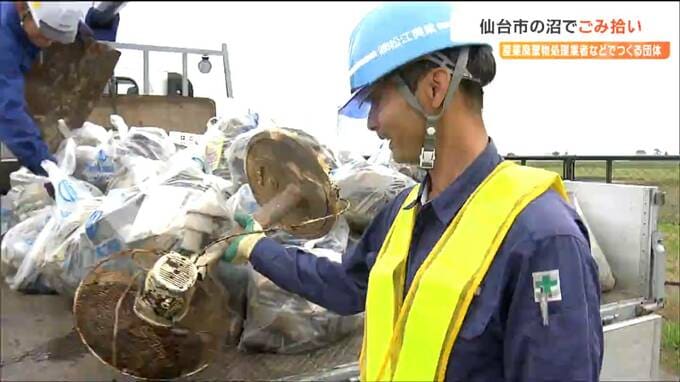 不法投棄をなくそうと、産業廃棄物処理業者などでつくる団体が仙台市内の沼でごみ拾いをしました。