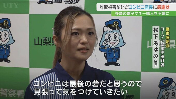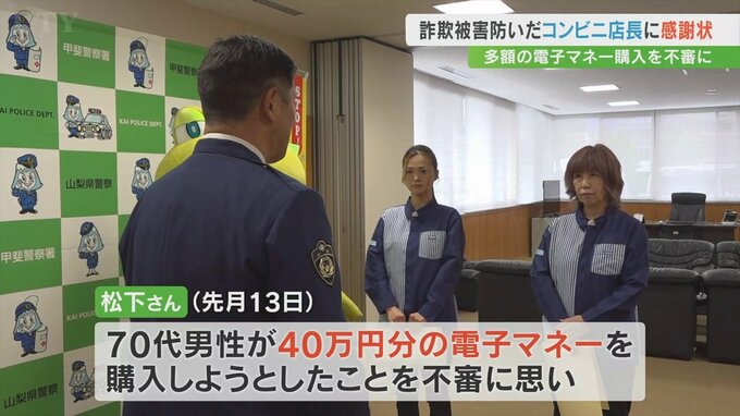 松下さんは9月13日店を訪れた70代の男性が40万円分の電子マネーを購入しようとしたことを不審に思い、隣にいた浅川多香子さんとともに詐欺の可能性を伝え警察に通報しました。