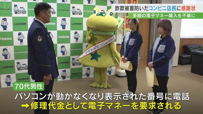 パソコンの修理代金として電子マネーを購入させる電話詐欺の被害を未然に防いだ韮崎市のコンビニエンスストアと店長に警察から感謝状が贈られました。