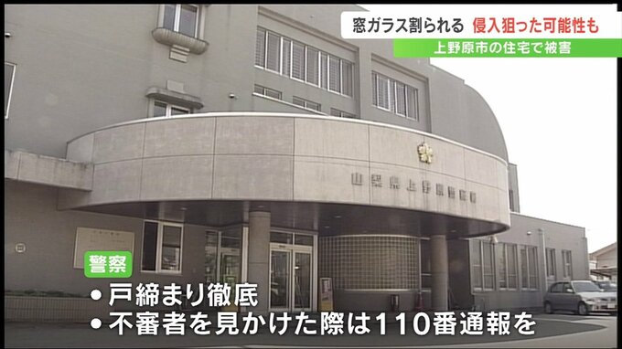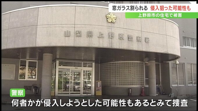 山梨県上野原市の住宅で窓ガラスが割られる被害があり、警察は何者かが侵入しようとした可能性もあるとみて調べています。