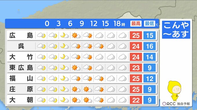 きょう23日(水)の広島県は、朝まで雨が残った地点もありましたが、日中は天気が回復し日差しも届きました。そして南よりの風が吹いた時間が長く、日中の気温はきのうよりも大幅に高くなりました。広島市中区の最高気温は、きのうよりも7℃ほど高く26.9℃でした。きょうは二十四節気でいうと霜降にあたります。霜が降りる頃という意味で、秋がだんだんと深まり、気温が下がるこの時期のことをいいます。