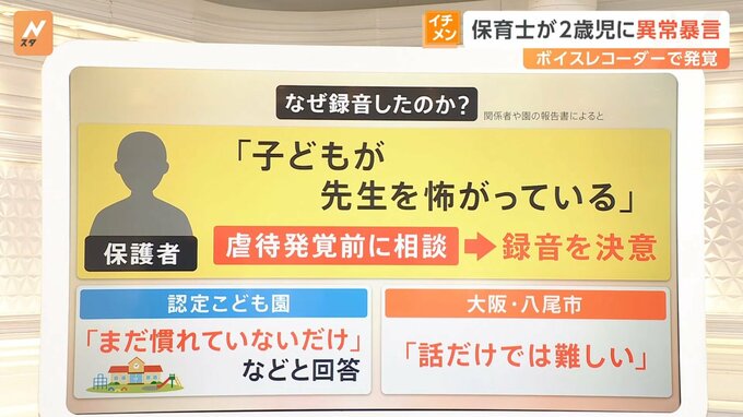 そもそも、保護者はなぜ録音をするにまで至ったのかですが、関係者や園の報告書によると、園に連れて行く際に子どもが先生を怖がっているような発言をしていたそうです。