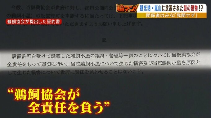 鵜飼協会が当時京都府に提出した誓約書には“鵜飼協会が鵜小屋の全責任を負う”と明記されています。