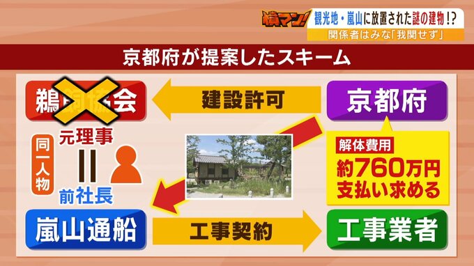 京都府から鵜小屋建設の許可を受けたのは鵜飼協会ですが、工事の契約は協会ではなく嵐山通船と工事業者の間で結ばれていました。鵜飼協会が解散したため、京都府は嵐山通船に対して鵜小屋の撤去費用として約760万円を支払うよう求めたのです。
