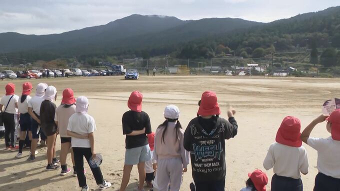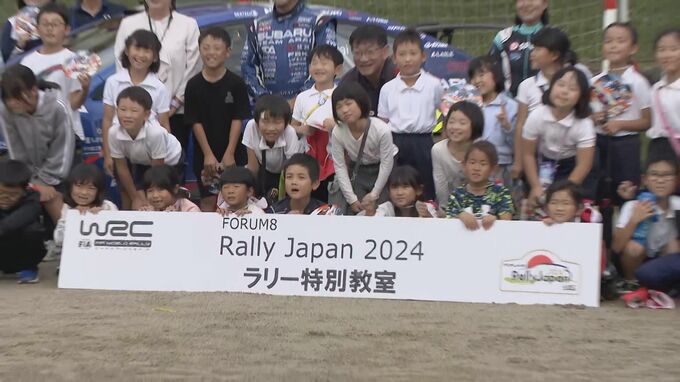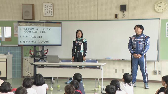 24日は出場選手の新井敏弘さんらによる特別授業が行われ、子どもたちは時速200キロで走るラリーの魅力を学び、実際の競技に使われていた車両のデモ走行も見学しました。