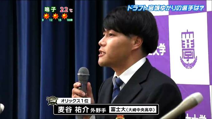 宮城県ゆかりの選手では、大崎中央高校出身・富士大学の麦谷祐介(むぎたに ゆうすけ)外野手がオリックスから1位指名、同じく富士大で東陵高校出身の佐藤柳之介(りゅうのすけ)投手が広島から2位指名を受けています。