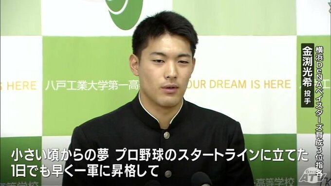 六戸町出身の金渕光希投手は、「横浜DeNAベイスターズ」から育成3位指名を受けました。県内で唯一、世代別の日本代表候補に選ばれた左腕です。