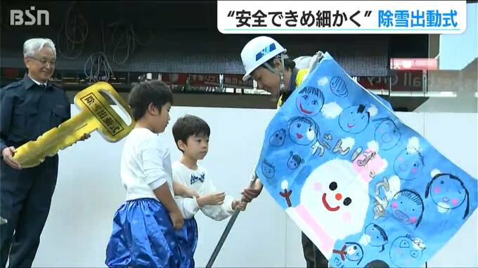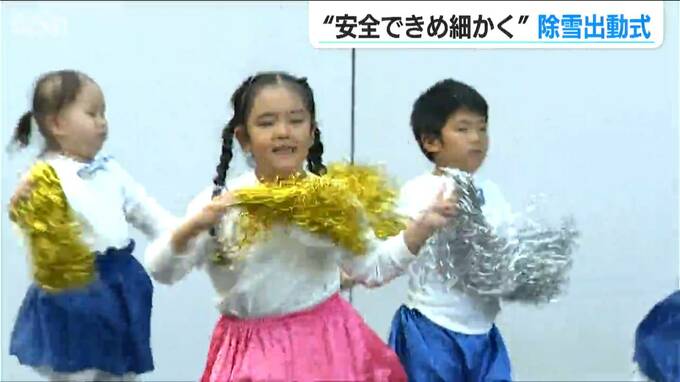 出動式には地元の園児も参加し、市民の生活を守る大切な冬の仕事をパワフルに応援。