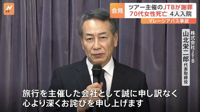 マレーシアで24日、日本人観光客11人を乗せたバスがトラックに衝突する事故があり、日本人1人が死亡しました。今回の事故を受け、ツアーを主催したJTBが先ほど、会見を開きました。株式会社JTB 山北栄二郎 代表…