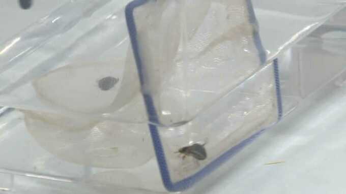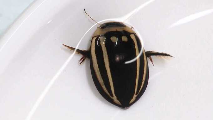 体長は約1.4センチ。背中にある4本の縦縞が特徴の「シマゲンゴロウ」。主に水田などに生息しています。