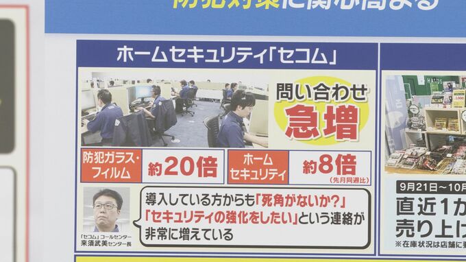 ホームセキュリティの「セコム」には問い合わせが急増しており、防犯ガラスやフィルムに関しての問い合わせは約20倍、ホームセキュリティについての問い合わせも約8倍となっています。
