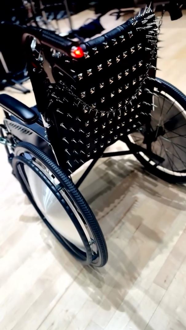 動画には、背にびっしりと銀色に輝く長いスパイク(棘)が並べられ、肘掛け下にスタッズ(鋲)とチェーン(鎖)で隙間無く飾られた車椅子が登場。ハンドル部にはなんとブレーキランプらしき灯火も備えられ、車輪のスポーク部もクロームに輝く円盤で覆われているうえに本体は黒いレザー(皮革)という、隅から隅までビジュアル系ロックな仕様。そして動画のBGMに「X JAPAN」の「Rusty Nail」のイントロを当て、完璧な雰囲気を醸し出しています。