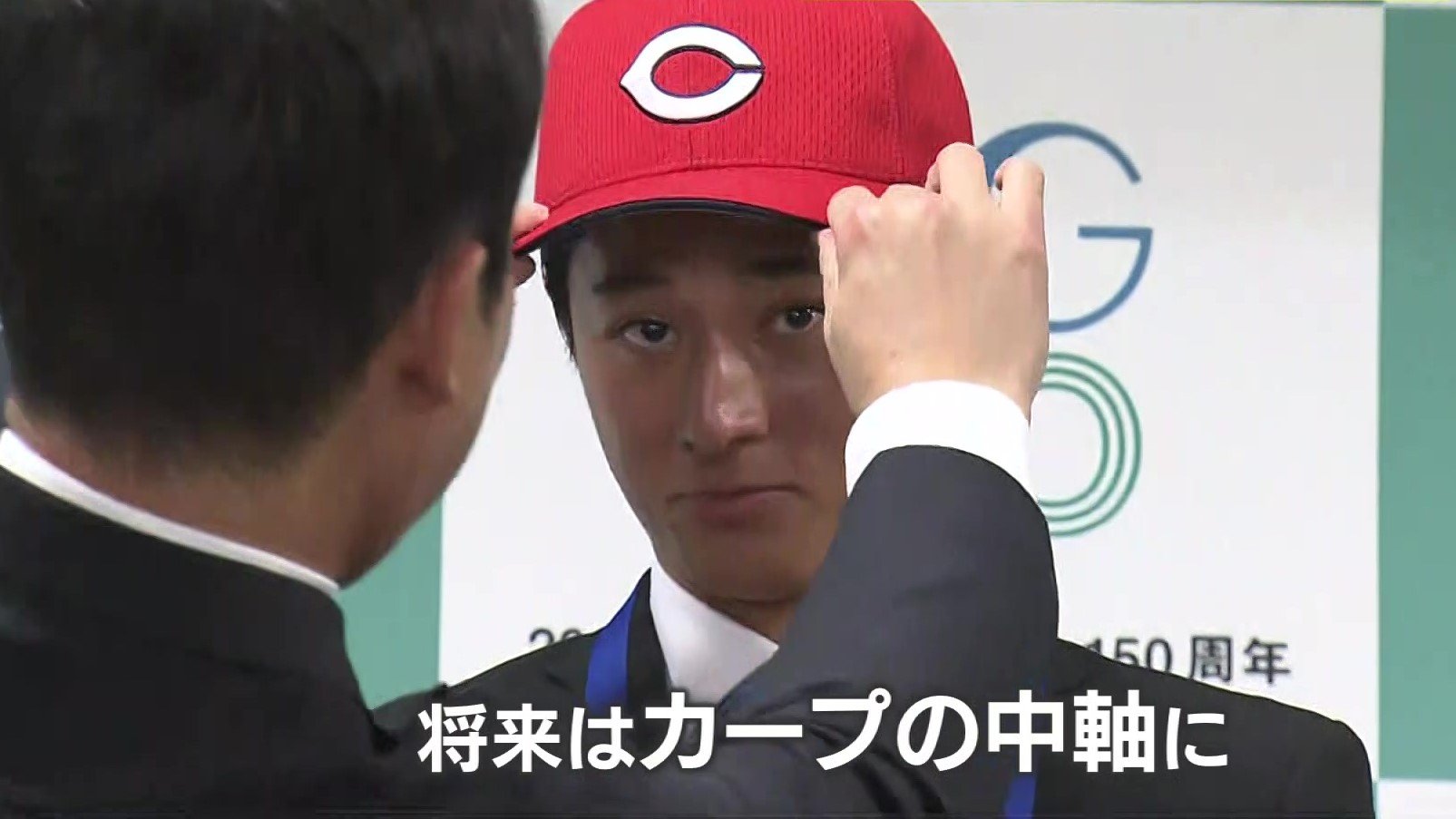 「RCCをご覧のみなさま、広島東洋カープより1位指名をいただきました青山学院大学の 佐々木泰 です。カープの中軸を張って将来、ホームラン王を獲れるようにがんばりたいと思いますのでご声援、よろしくお願いします」