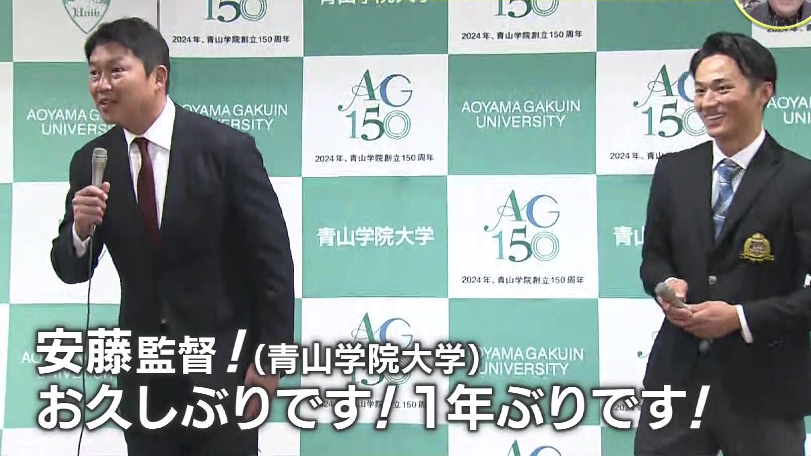 指名からおよそ2時間後、新井貴浩 監督も、指名後のあいさつに青山学院大学へ。