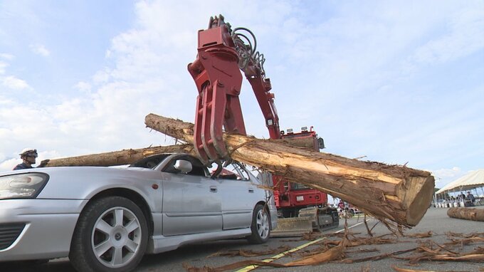訓練は道の駅の駐車場を高速道路にみたてて行われ、中部横断道の斜面で土砂の崩落があり、走行中の乗用車2台が巻き込まれたことを想定して実施しました。
