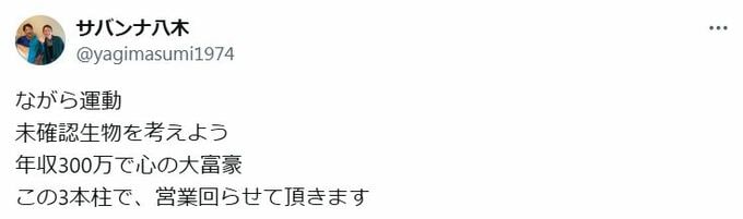 八木さんは全国を巡って、相方とともに「お金の扱い方」について「お笑いを交えながら講習会」を開きたいと熱望しており、自身のXでも「ながら運動 未確認生物を考えよう 年収300万で心の大富豪 この3本柱で、営業回らせて頂きます」と、今後の仕事に思いを馳せています。