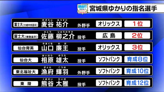 県内ゆかりの選手の指名一覧です。仙台大学の相原雄太投手、東北福祉大学の漁府輝羽外野手、東陵高校の熊谷大雅投手がソフトバンクにそれぞれ育成ドラフトで指名されました。