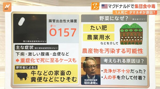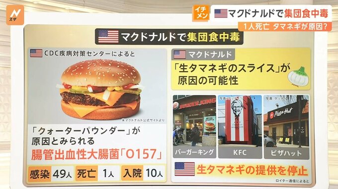 アメリカで発生した「O157」による集団食中毒。マクドナルドのハンバーガーが原因とみられていて、大手飲食チェーンにも影響が広がっています。