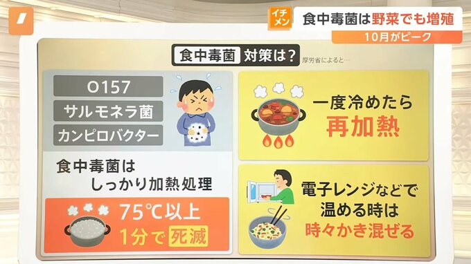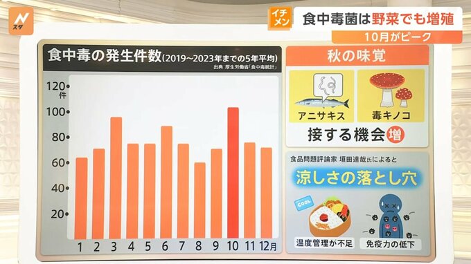 温度管理では涼しくなって弁当などに保冷剤を入れなくなったり、免疫力では寒暖差や季節の変わり目などで体調を崩したりと、本来感染しても発症しないであろう菌も発症してしまうことがあるそうです。
