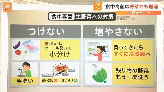 生野菜への対策について、食品問題評論家の垣田達哉氏によると、「つけない」という点として、▼肉と魚はビニール袋などで小分けにすること、▼手洗いをしっかり行うこと、▼まな板・包丁・調理用手袋は使いまわしをせず、使い分けることも重要になるそうです。