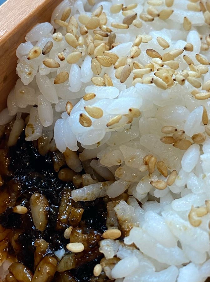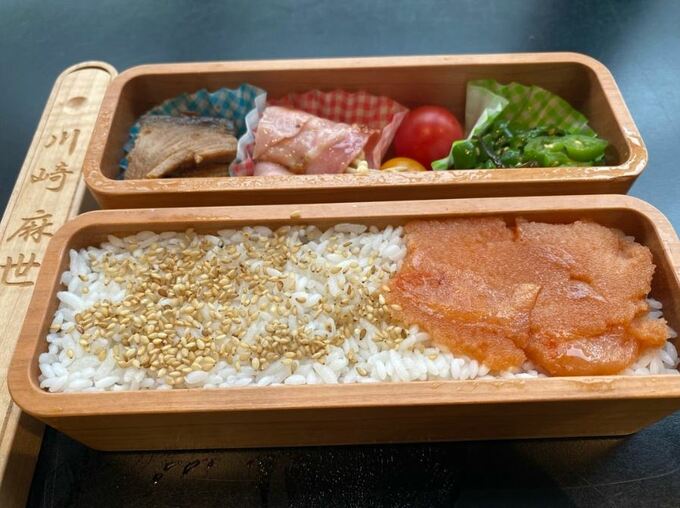 麻世さんは「ご飯はごまと明太子乗せだが!!」「なんと弁当箱の蓋に付かないように」「大好きな磯自慢がサンドしてある!」と、お弁当のフタの裏に付いてしまいがちな海苔の佃煮が、ご飯の層に挟んであることに感嘆し、その接写まで投稿するほどの感激っぷり。
