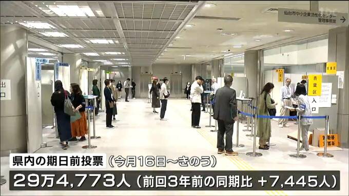 ところで県選挙管理委員会によりますと、県内で今月16日から25日までの10日間に期日前投票をした人は29万4773人で、前回3年前の衆院選の同じ時期を7445人上回っています。