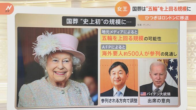 国葬は19日午前11時からウェストミンスター寺院で執り行われますが、史上初の規模になりそうです。地元メディアによりますと在位70年ということもあり、規模は五輪を上回る可能性があるということです。さらにAFP通信によりますと海外要人は約500人が参列する見通しです。この中には天皇陛下もいらっしゃいます。バイデン大統領も出席の意向だということです。