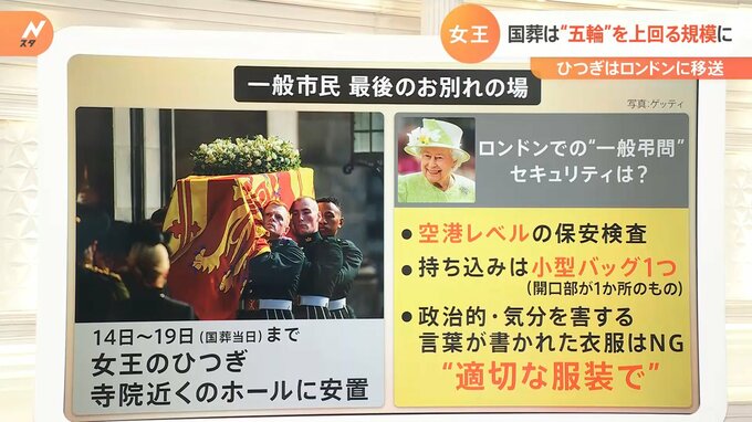 一般弔問はエディンバラで行われていますがロンドンでの一般弔問は14日から19日、国葬の当日までウェストミンスター寺院近くのホールで行われます。ただセキュリティが大変厳重で空港レベルの保安検査があるそうなんです。